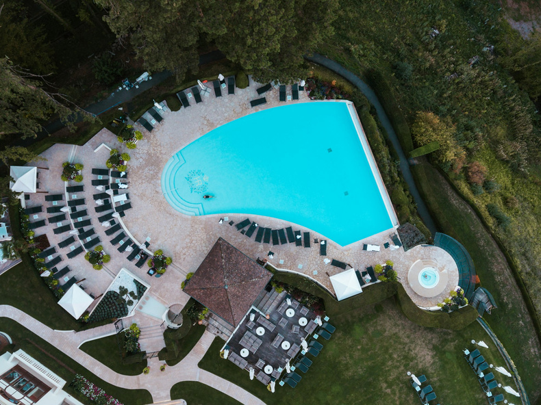 Foto yang diambil dengan posisi angle ini akan memperlihatkan sudut pengambilan gambar dari ketinggian. Contohnya seperti foto diatas yang menampilkan seluruh isi lingkungan, seperti kolam renang, kursi, dan pepohonan.